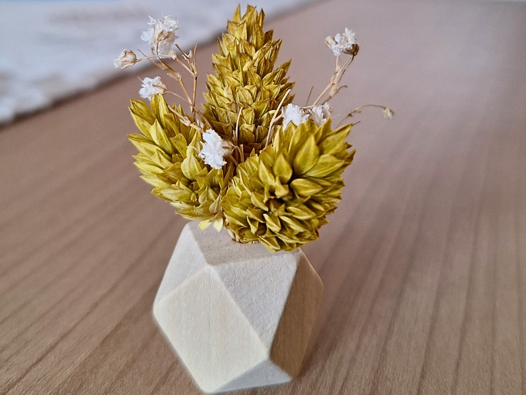 Schnappe dir zwei Holzkugeln und arrangiere ein paar Trockenblumen in dem Loch. Diese „Vasen“ kannst du in die Bücherregale stellen oder als Bodenvasen benutzen.