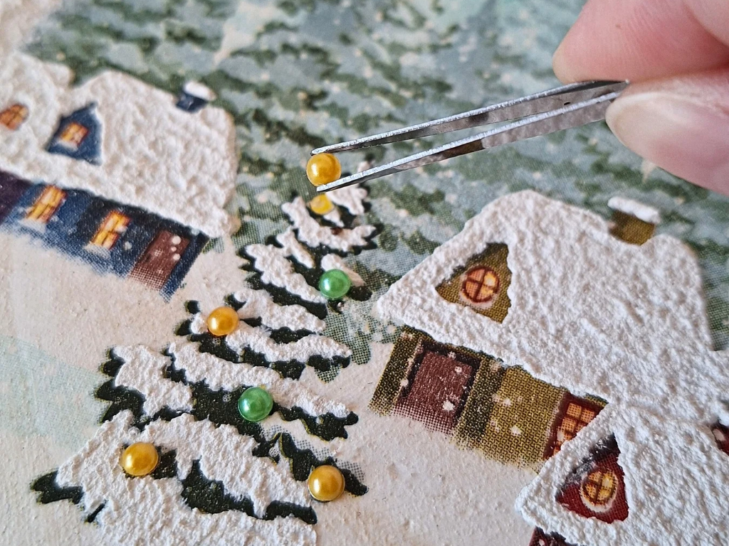 Schritt 6: Beklebe die Weihnachtskugeln in dem Tannenbaum auf der Serviette mit den kleinen Halbperlen.